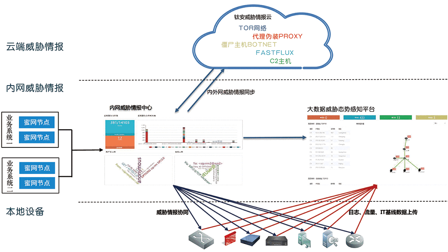 钛安独创的企业内网威胁情报中心,改变了被动防御的传统安全模式,基于入侵欺骗技术,通过高度仿真的蜜网技术有效解决了现有安全产品误报率高,无法准确发现内网攻击行为等问题。结合云端广泛的外网威胁情报信息,可为内网多源日志的关联分析提供高可信情报信息,有效提升APT攻击和横向移动攻击的识别准确率。同时作为内网威胁情报中心,可将威胁情报协同分享给现有安全设备,完善现网纵深防御体系。