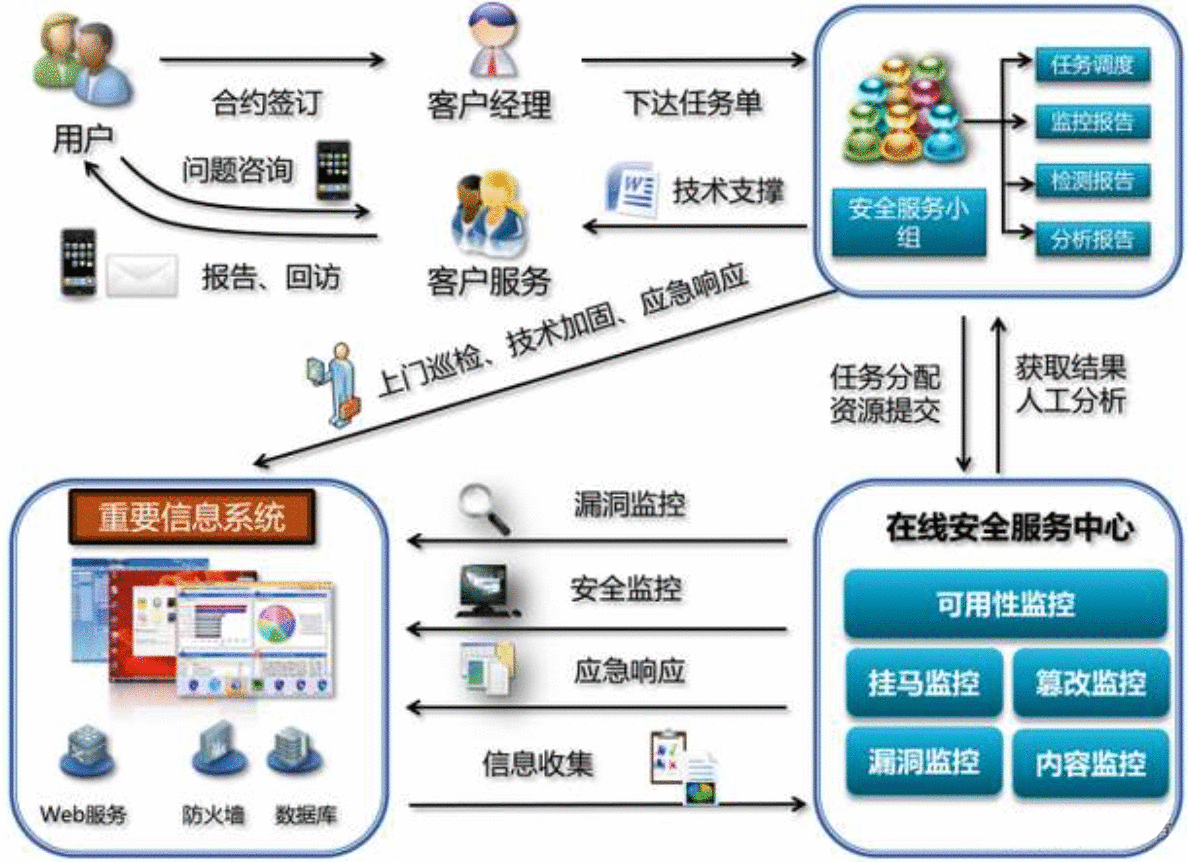 铵安科技构建了专业的信息安全运营服务团队,凭借丰富的攻防经验和规范化的服务水平,依托强大的安全服务支撑平台,为客户提供“安全运维服务”(Managed Security Services Provider,SI-MSS)。铵安科技“安全运维服务(SI-MSS)”,以现场为主,远程为辅,采用主动预防的方式,面向各级政府数据中心、云计算数据中心、政府网站群、企业数据中心等提供安全运维服务。为用户提供专业安全保障,降低信息安全投入成本,使用户专注于自己的核心业务,提高本单位的综合竞争力,提升客户在安全方面的投入产出比。 体系结构图如下所示: |