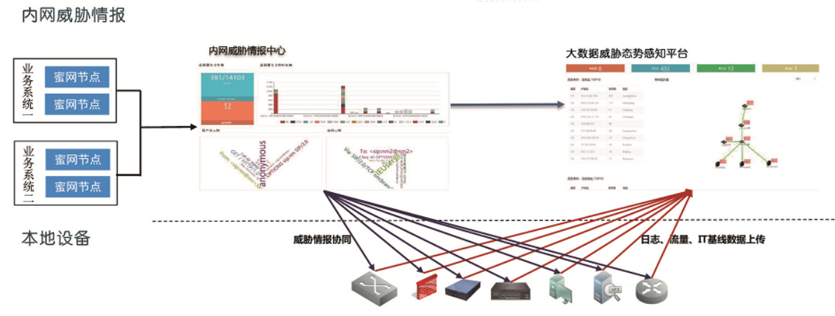 在通过内网威胁情报中心获取ATP攻击源、蠕虫病毒传播源等内网威胁情报信息的同时,钛安日志大数据分析系统全面采集现网安全设备(IDS、防病毒、上网行为管理、桌面终端管理)日志信息,网络流量数据。运用关联分析、数据建模、机器学习等技术手段,进行大数据分析。并通过可视化技术进行多样化的展现,使用户可以在统一的平台上,全方位实时感知内网安全态势,检测安全威胁和异常行为,快速响应和处置安全事件,实现安全管理的智能化。